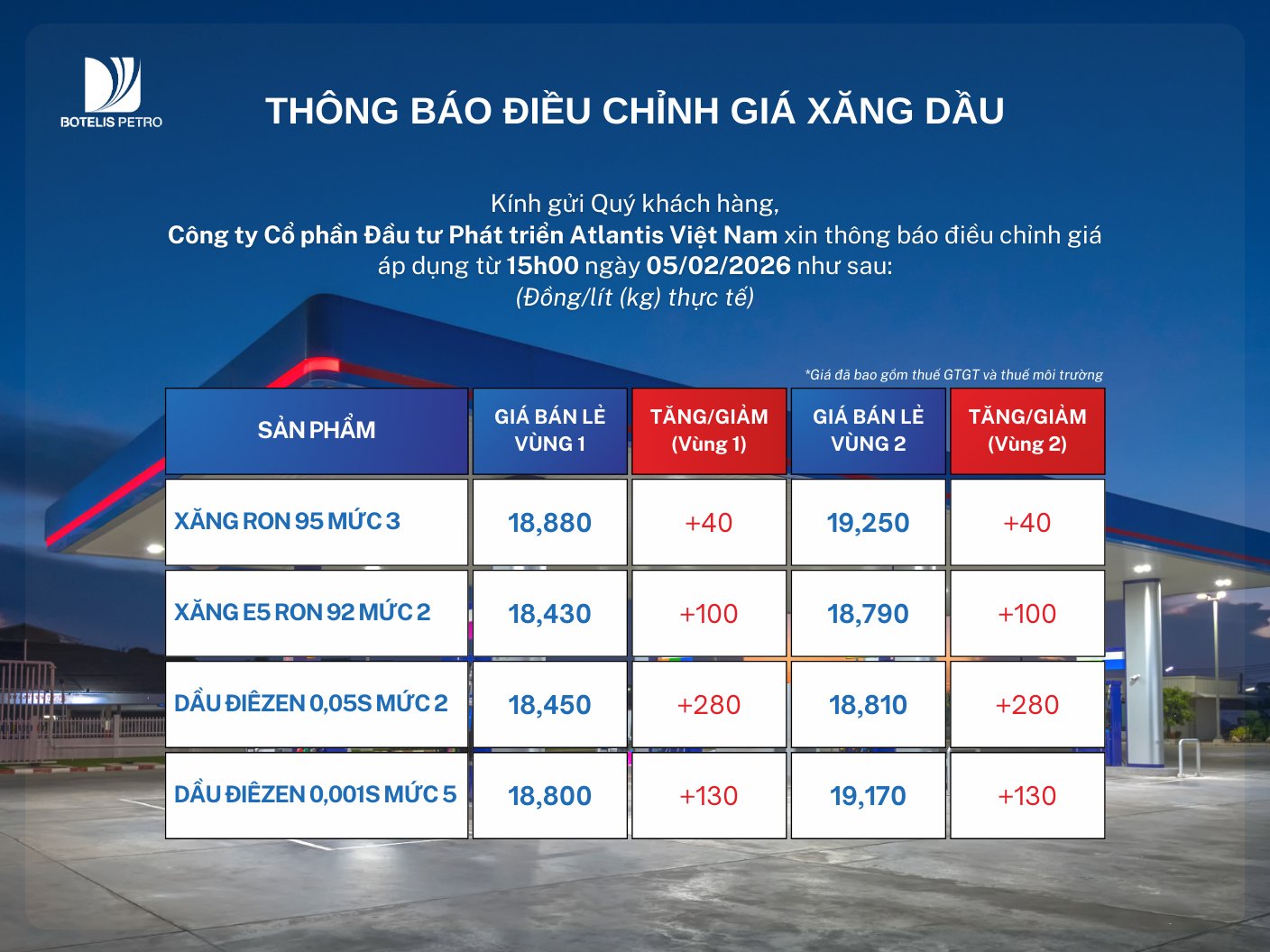 Theo kỳ điều hành xăng dầu của Liên Bộ Công thương-Tài chính, từ 15 giờ ngày 05/02/2026, Botelis Petro (Công ty Cổ phần Đầu tư Phát triển Atlantis Việt Nam) xin thông báo giá bán lẻ xăng dầu được điều chỉnh như sau: