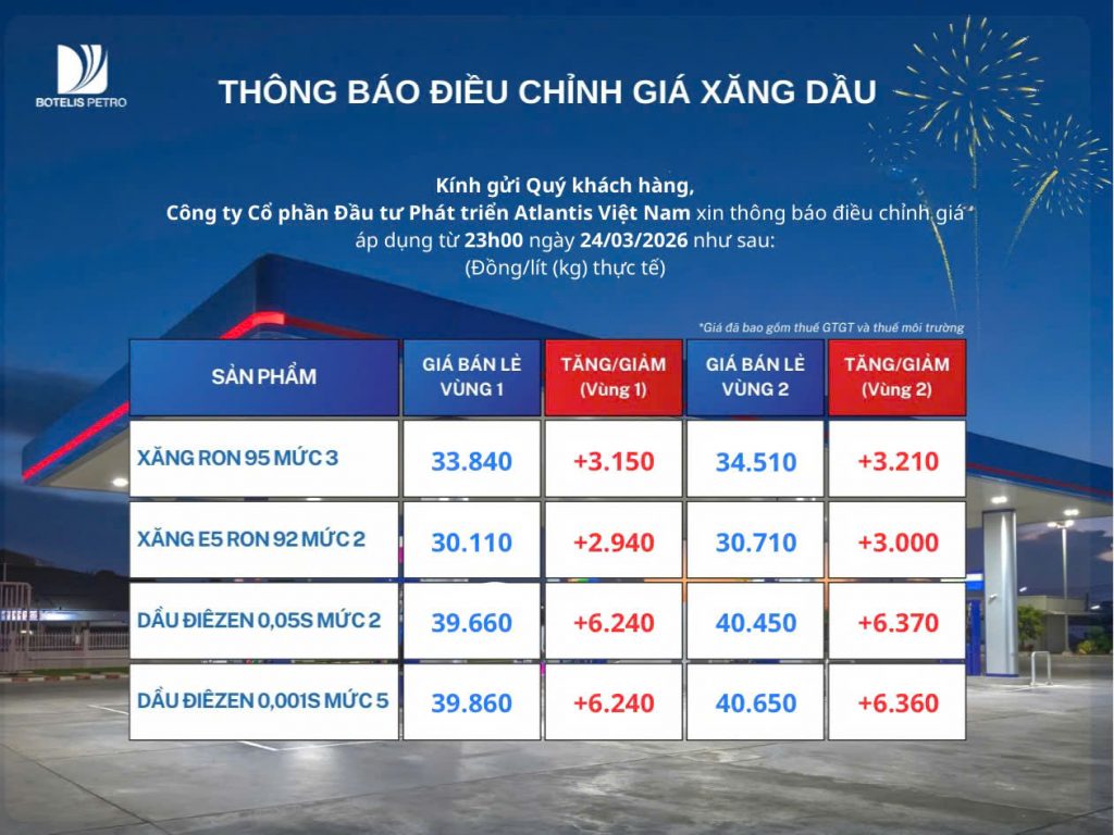 Công ty Cổ phần Đầu tư Phát triển Atlantis Việt Nam xin thông báo đổi giá bán lẻ xăng dầu áp dụng từ 23h00 ngày 24/03/2026 cụ thể như sau: